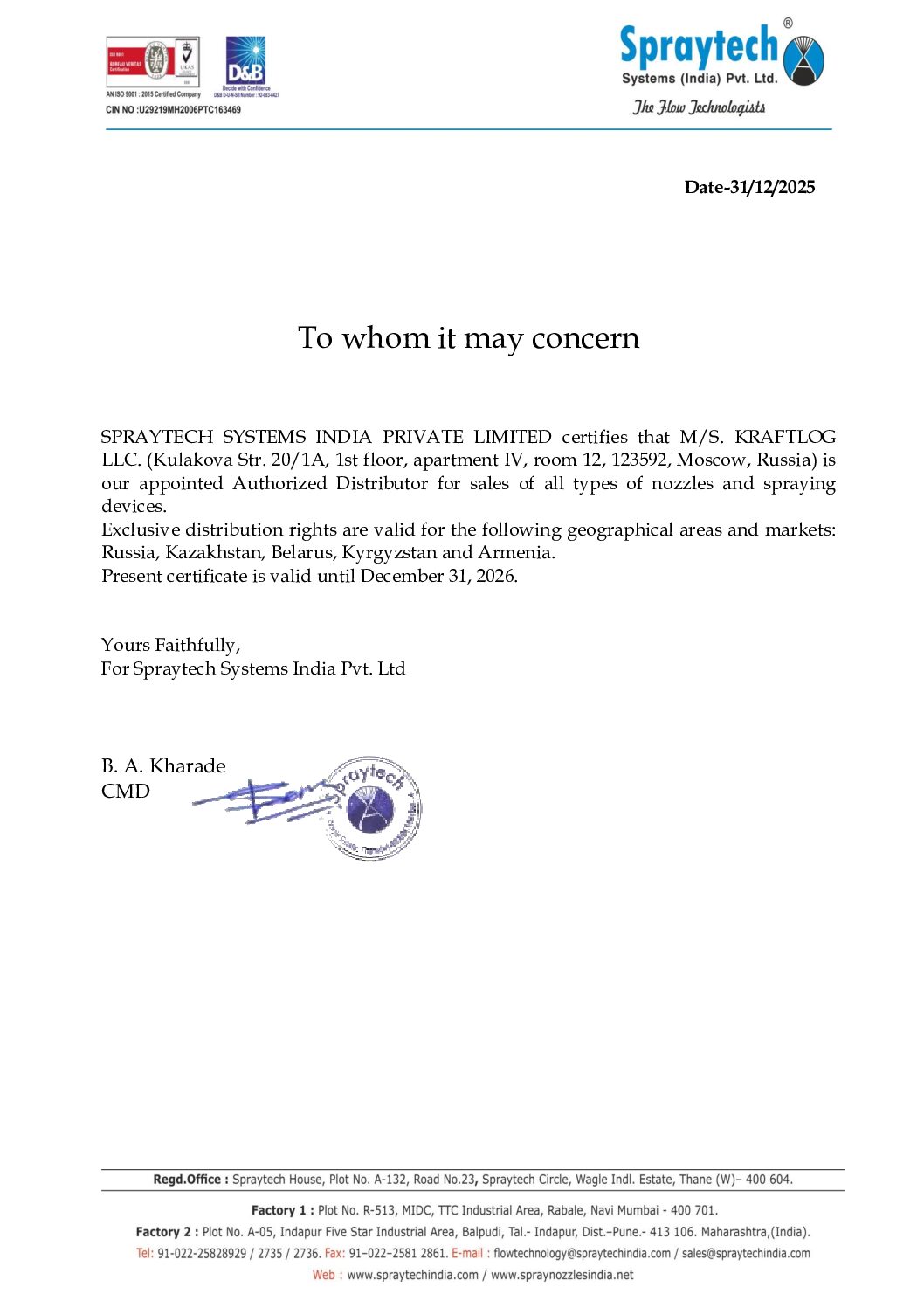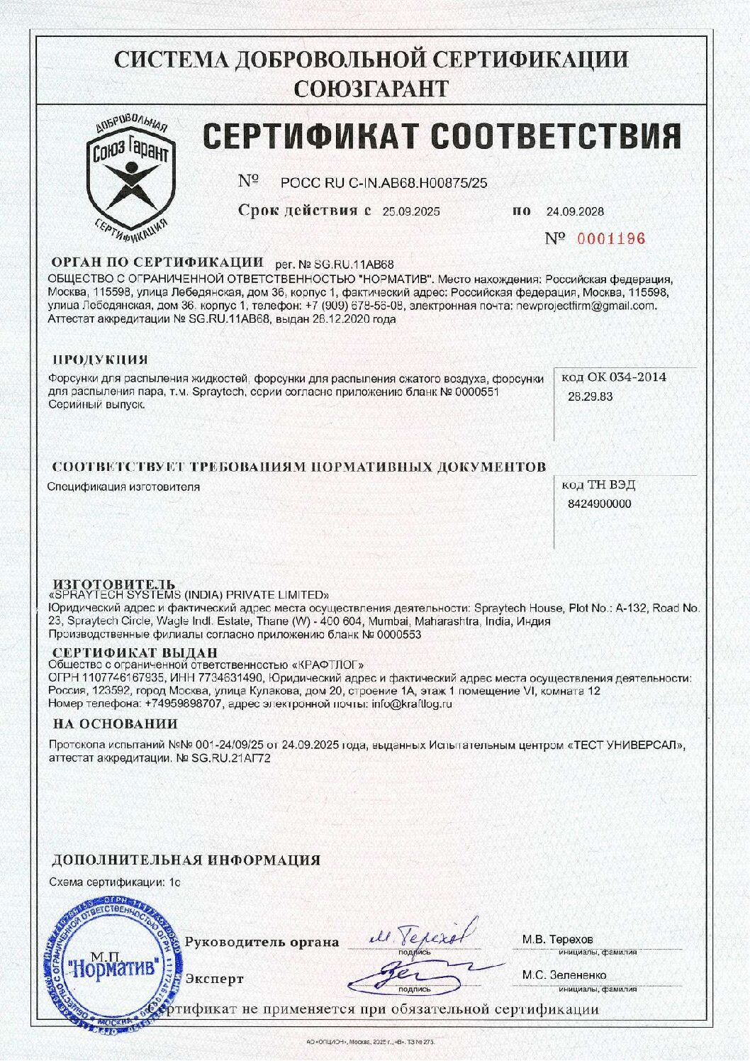 Продукцию Spraytech на рынке России, а также в странах ЕАЭС (Армения, Кыргызстан, Казахстан, Беларусь) с 2022 года представляет компания ООО “КРАФТЛОГ”. Большинство артикулов форсунок и распылительных систем не подлежат обязательной сертификации по Техническим регламентам Таможенного Союза (ТР ТС/ЕАЭС). Сам индийский производитель имеет действующий сертификат системы менеджмента качества ISO.
